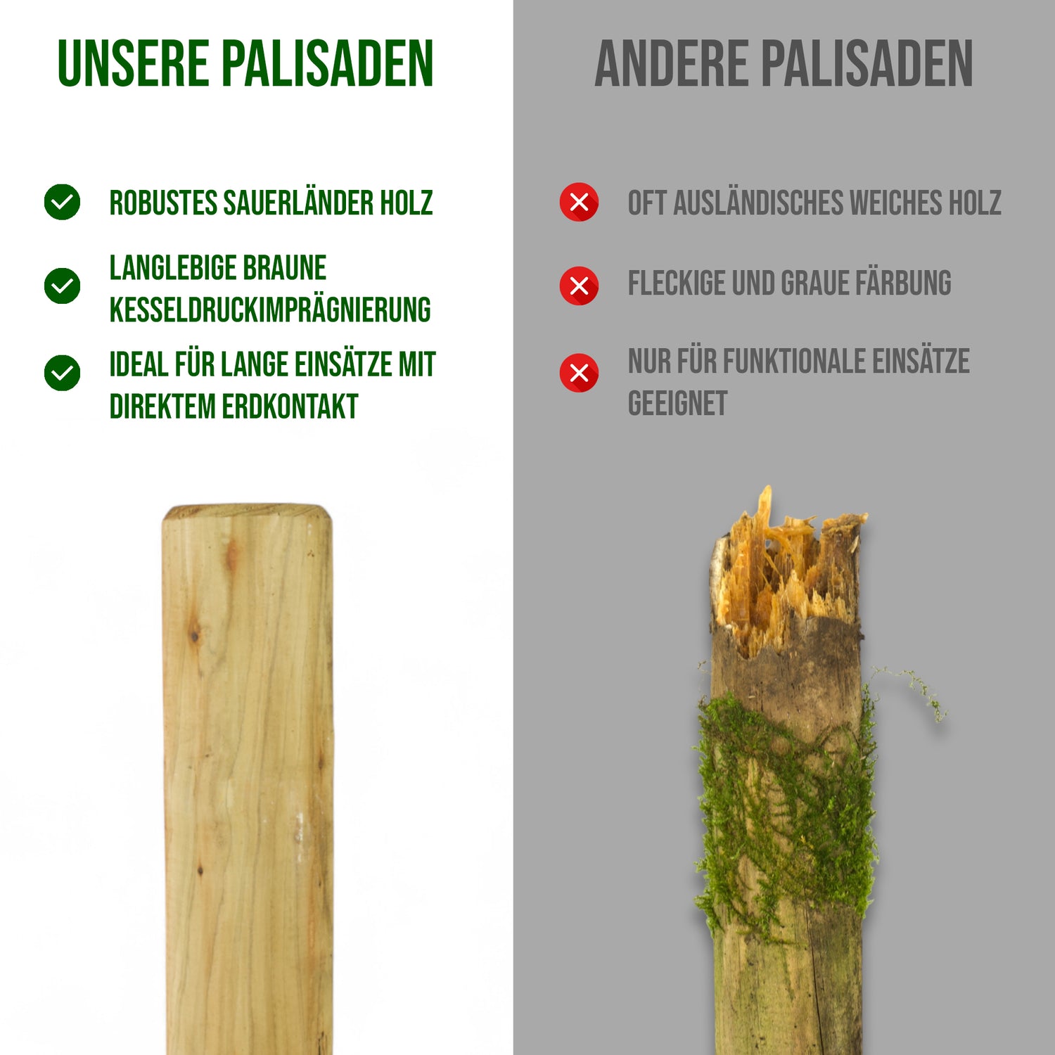 Die Kombination aus funktionalem Nutzen, natürlicher Optik und langer Haltbarkeit macht die Minipalisade zu einem echten Allrounder in der Gartengestaltung. Jedes Stück wird sorgfältig verarbeitet und ist ein Qualitätsprodukt aus dem Sauerland, das deinen Garten über viele Jahre hinweg verschönert und strukturiert.