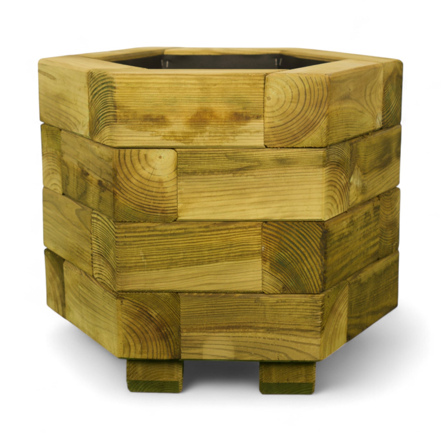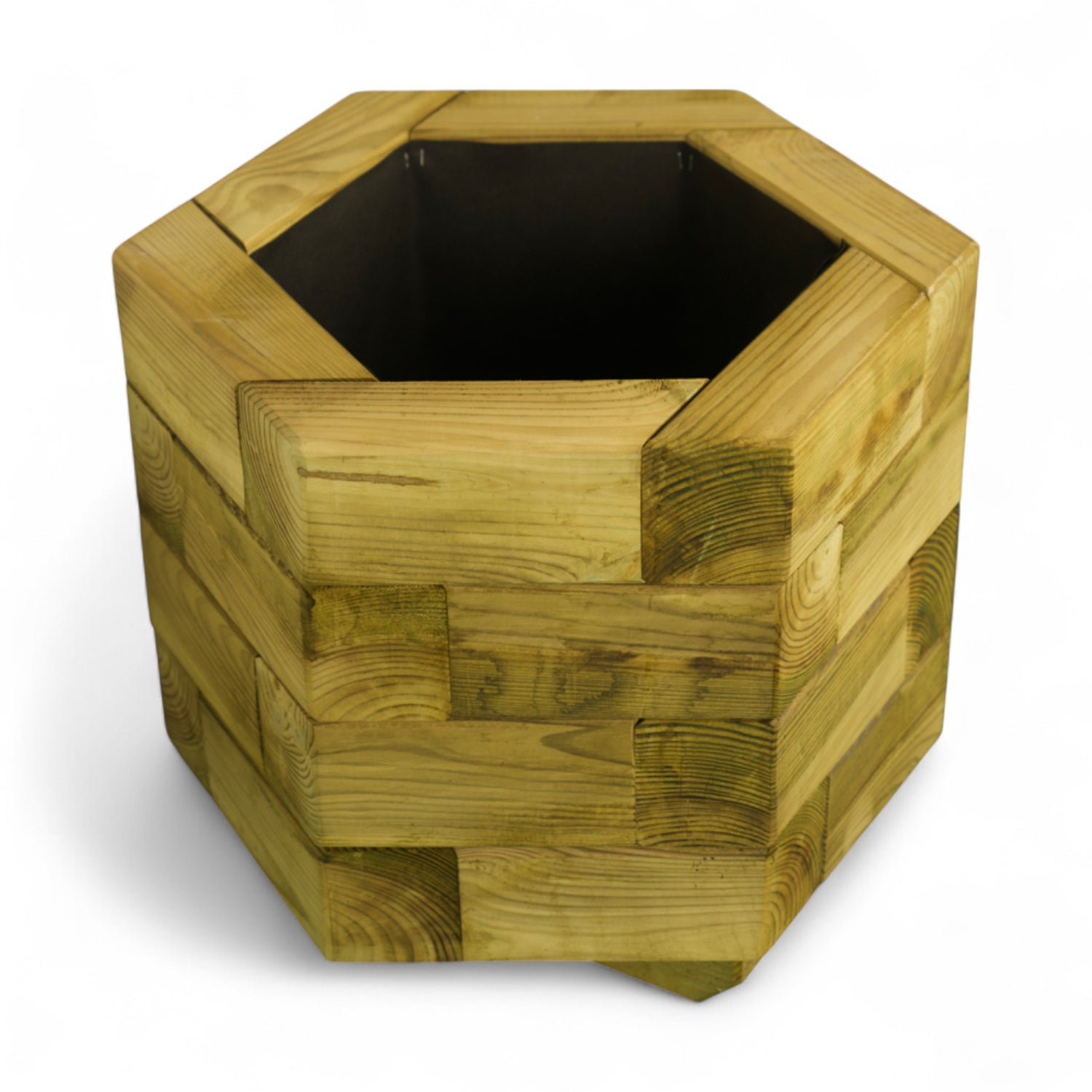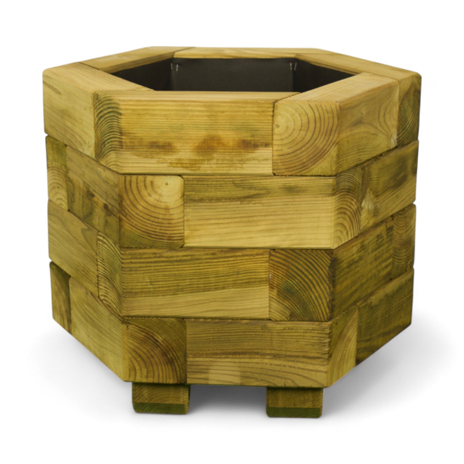 Der Arpe ist ein hochwertiger Pflanzkübel in sechseckiger Form, der durch sein massives Design und die auffällige Holzstruktur sofort ins Auge fällt. Hergestellt aus druckimprägniertem Nadelholz ist er durch die Kesseldruckimprägnierung (KDI) in grün optimal vor Witterung, Feuchtigkeit und Schädlingen geschützt – ideal für den dauerhaften Einsatz im Außenbereich.