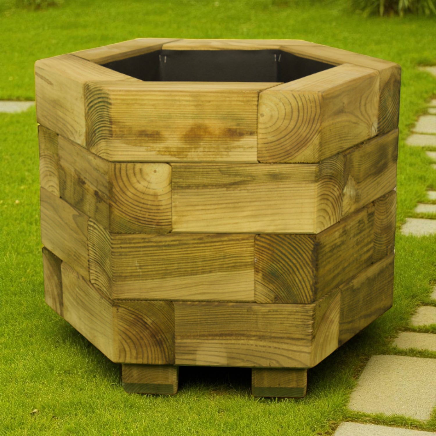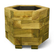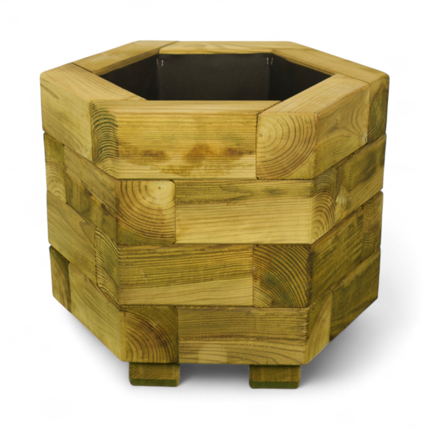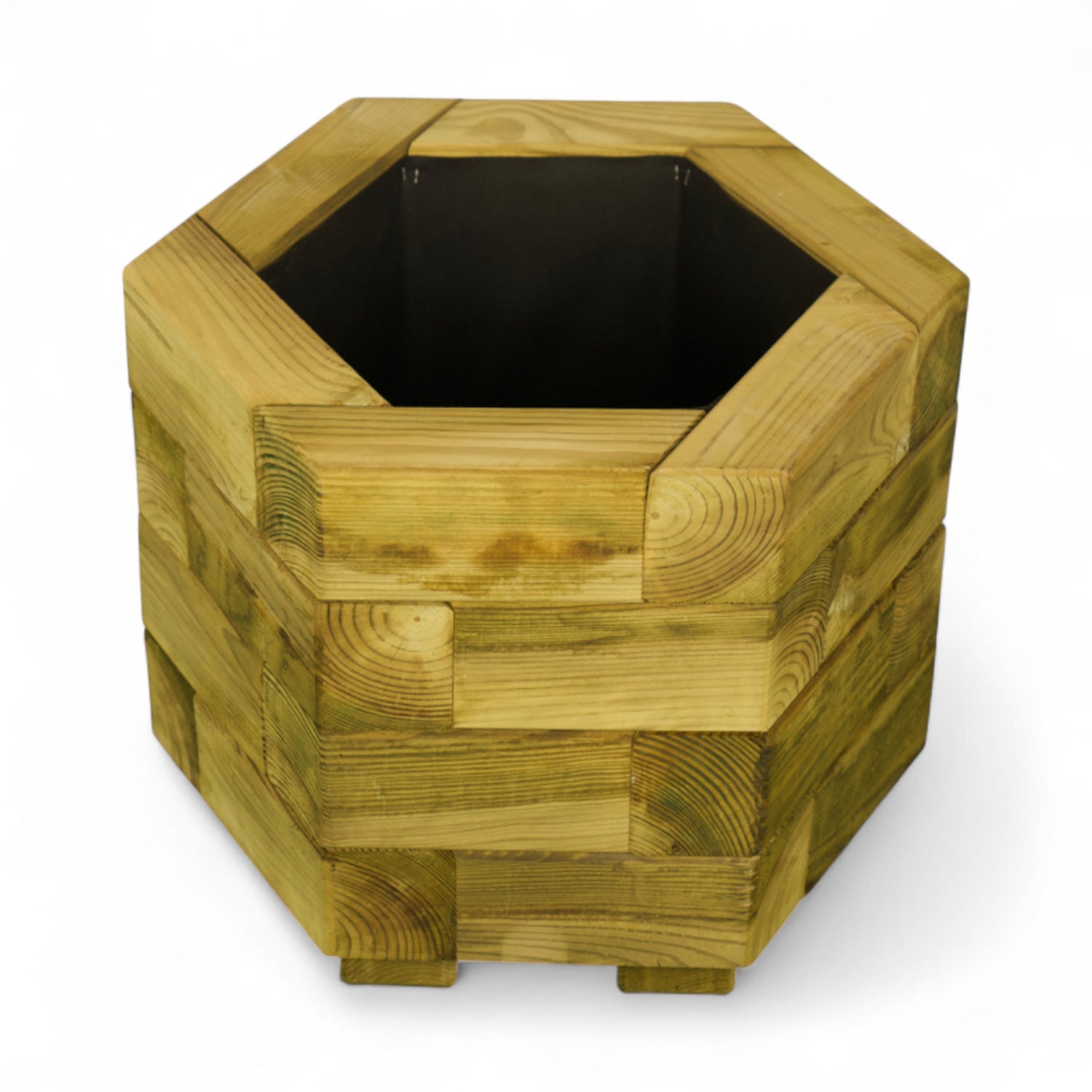 Der Arpe ist ein hochwertiger Pflanzkübel in sechseckiger Form, der durch sein massives Design und die auffällige Holzstruktur sofort ins Auge fällt. Hergestellt aus druckimprägniertem Nadelholz ist er durch die Kesseldruckimprägnierung (KDI) in grün optimal vor Witterung, Feuchtigkeit und Schädlingen geschützt – ideal für den dauerhaften Einsatz im Außenbereich.
