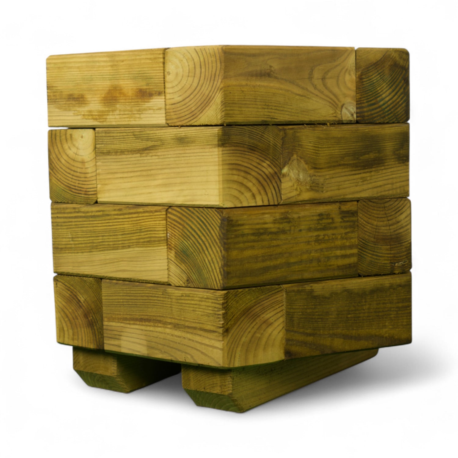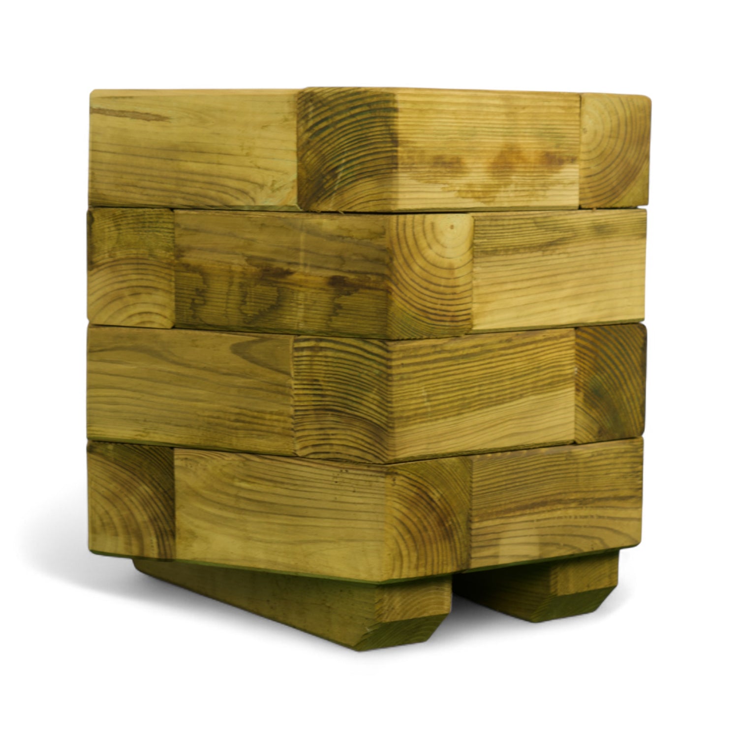Die verschachtelte Anordnung der Holzblöcke verleiht dem Kübel ein modernes, fast architektonisches Erscheinungsbild. Die stabile Konstruktion auf vier Standfüßen sorgt für eine gute Belüftung von unten und schützt den Untergrund. Im Inneren befindet sich eine passgenaue Pflanzfolie, die das Holz zusätzlich schützt und das direkte Bepflanzen ohne zusätzlichen Einsatz ermöglicht.