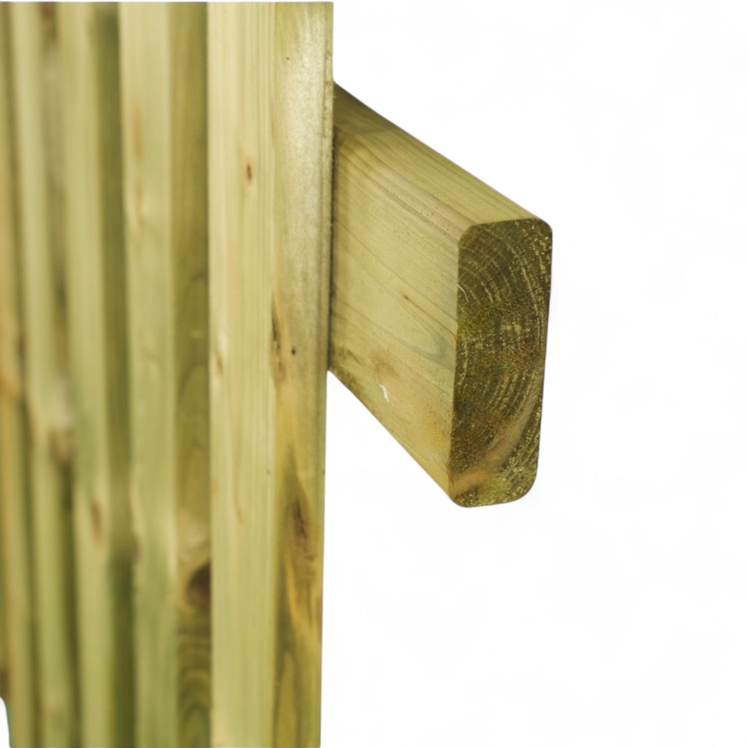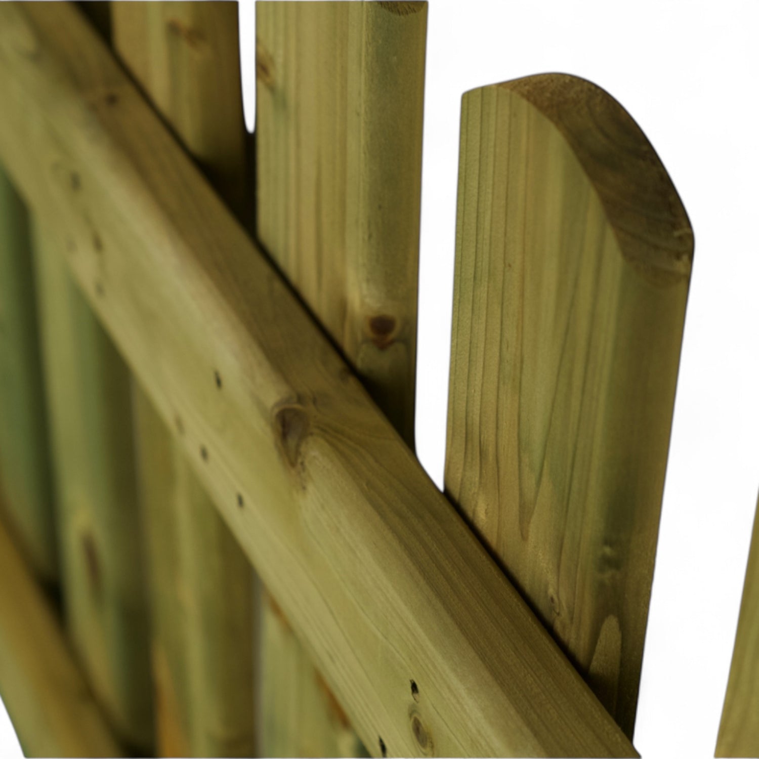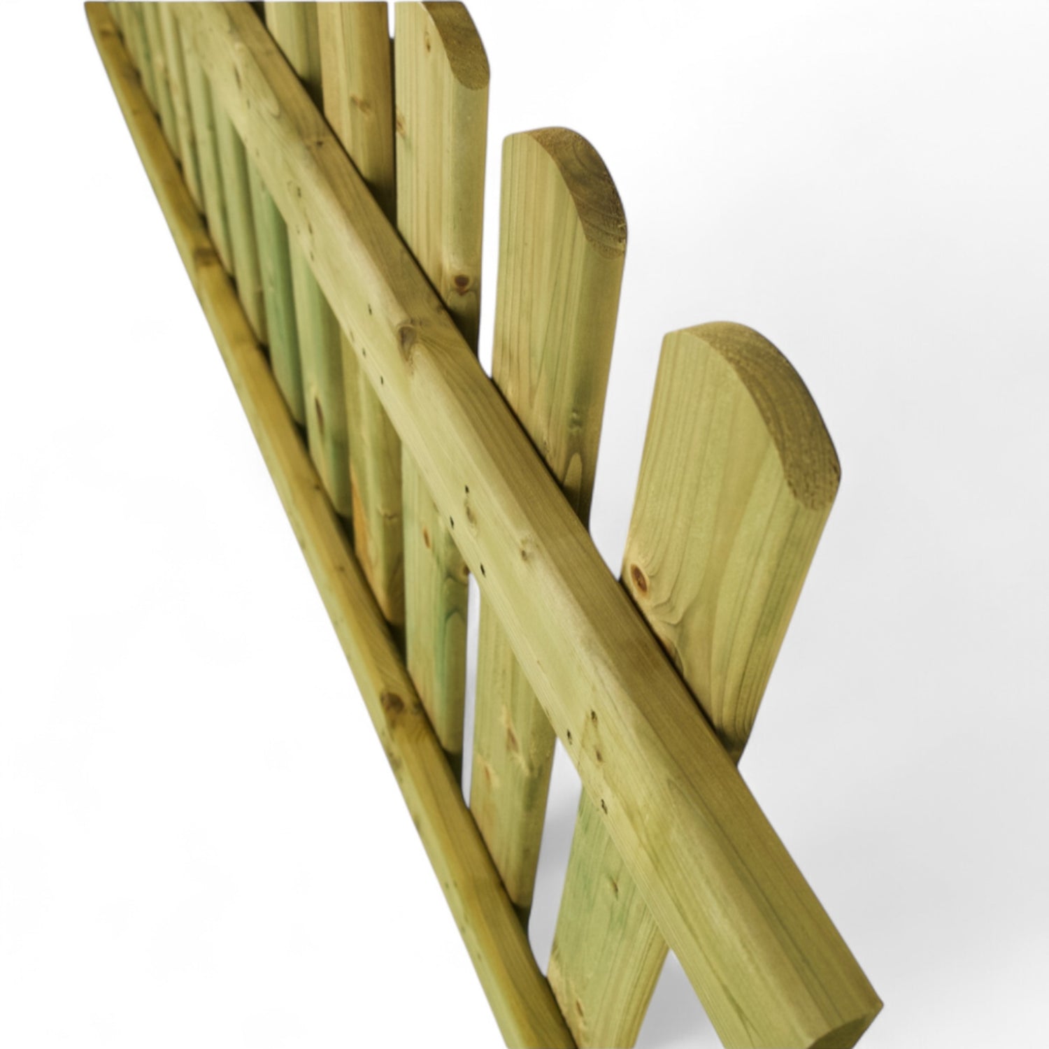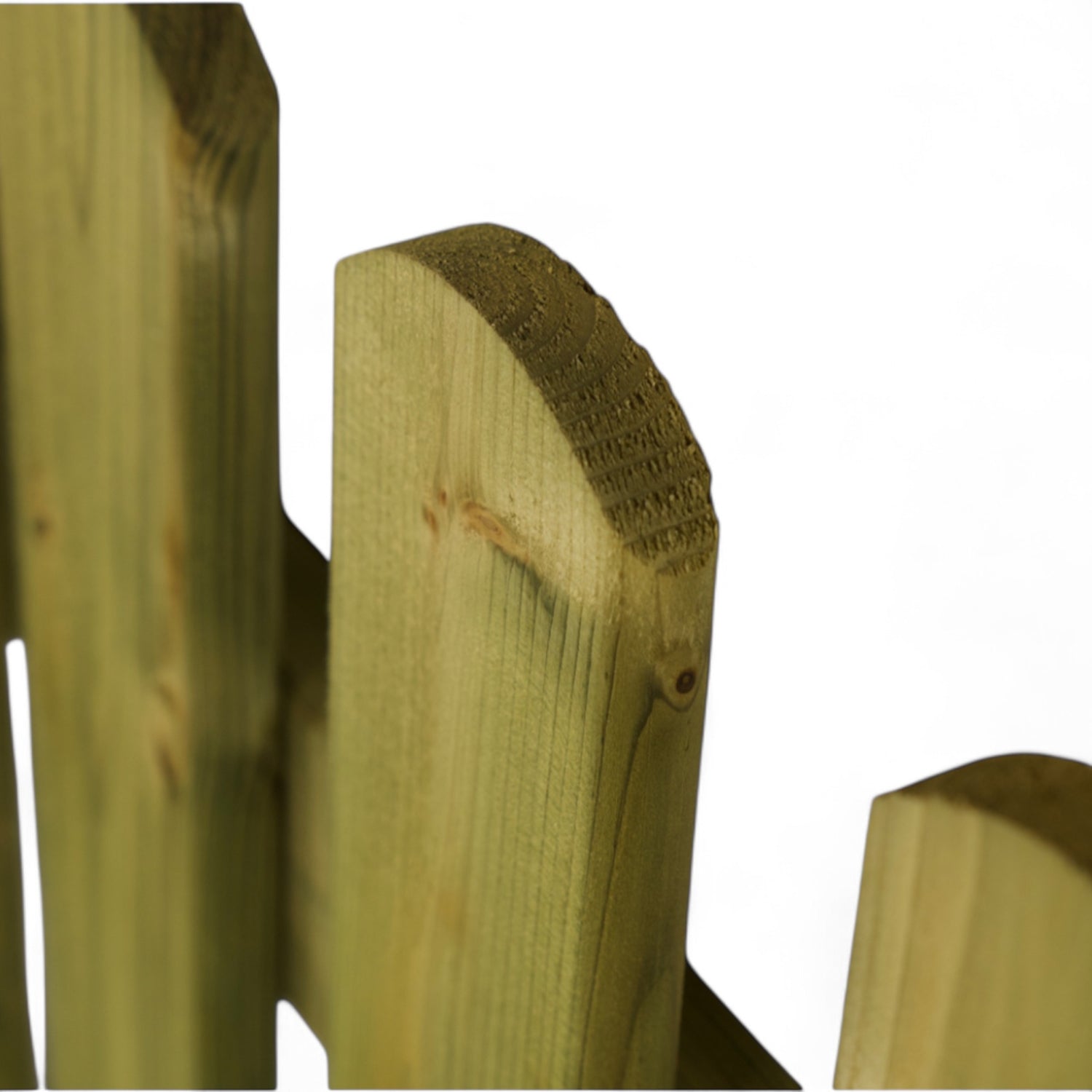 Der Glörzaun ist ein zeitloses Gartenzaunelement aus kesseldruckimprägnierter Sauerländer Fichte. Die senkrechten Lamellen mit sanft gerundeten Köpfen sorgen für eine klassische Optik, die in jeden Garten passt – egal ob am Vorgarten, entlang von Wegen oder als freundliche Grundstücksgrenze. Die grüne Imprägnierung schützt das Holz dauerhaft vor Wind, Wetter und Schädlingen und bewahrt die natürliche Ausstrahlung des Zauns.