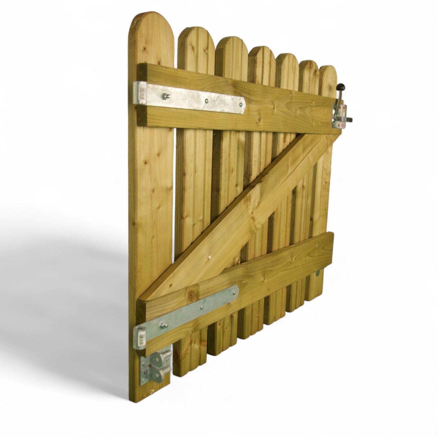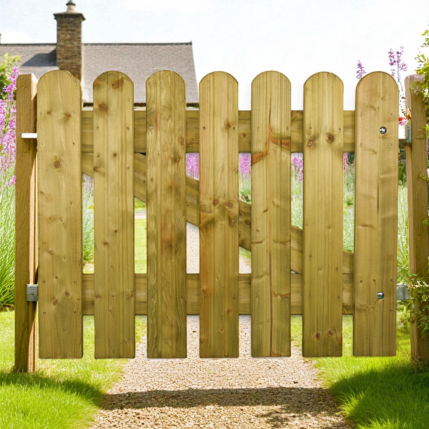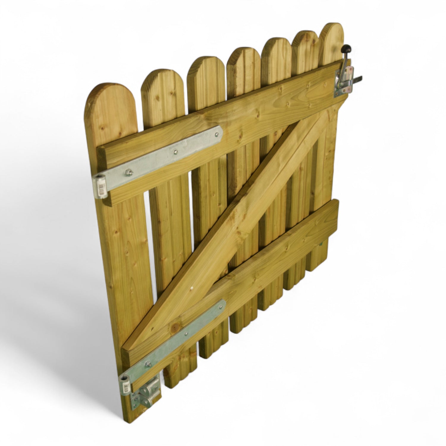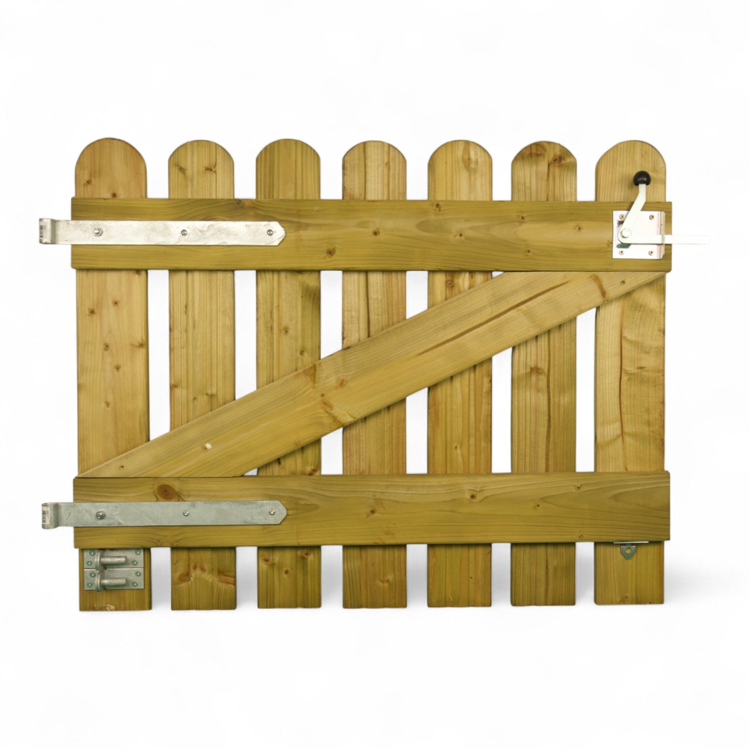 Gefertigt aus hochwertigem, kesseldruckimprägniertem Nadelholz (KDI grün) ist das Tor optimal vor Witterung, Feuchtigkeit und Schädlingsbefall geschützt. Zwei Querstreben auf der Rückseite sorgen für zusätzliche Stabilität und Langlebigkeit im täglichen Einsatz.