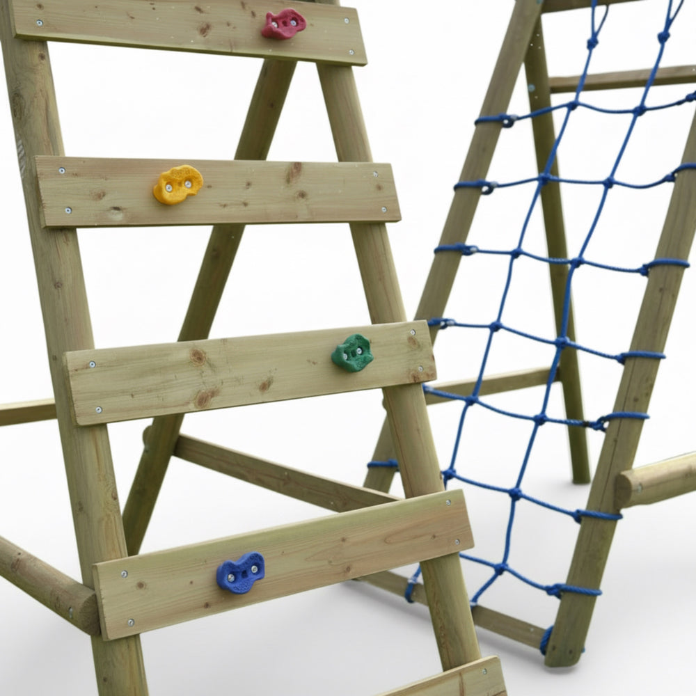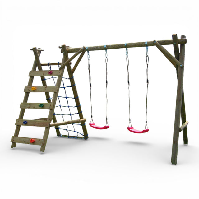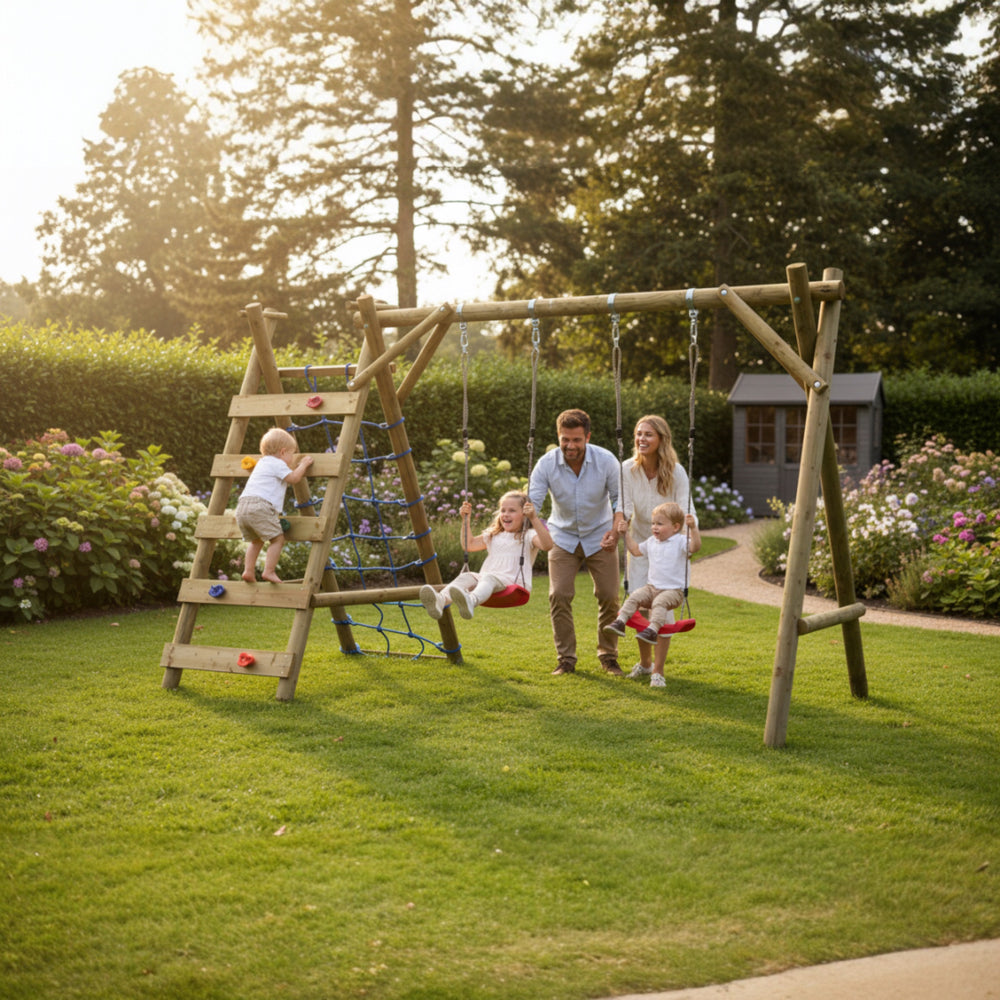 Die stabile Holzkonstruktion mit mehreren Schaukelsitzen und integriertem Kletterelement sorgt für abwechslungsreiche Nutzungsmöglichkeiten und lange Freude am Spielen. Robuste Aufhängungen, solide Querbalken und eine durchdachte Bauweise gewährleisten sicheren Halt und zuverlässige Stabilität im täglichen Gebrauch.