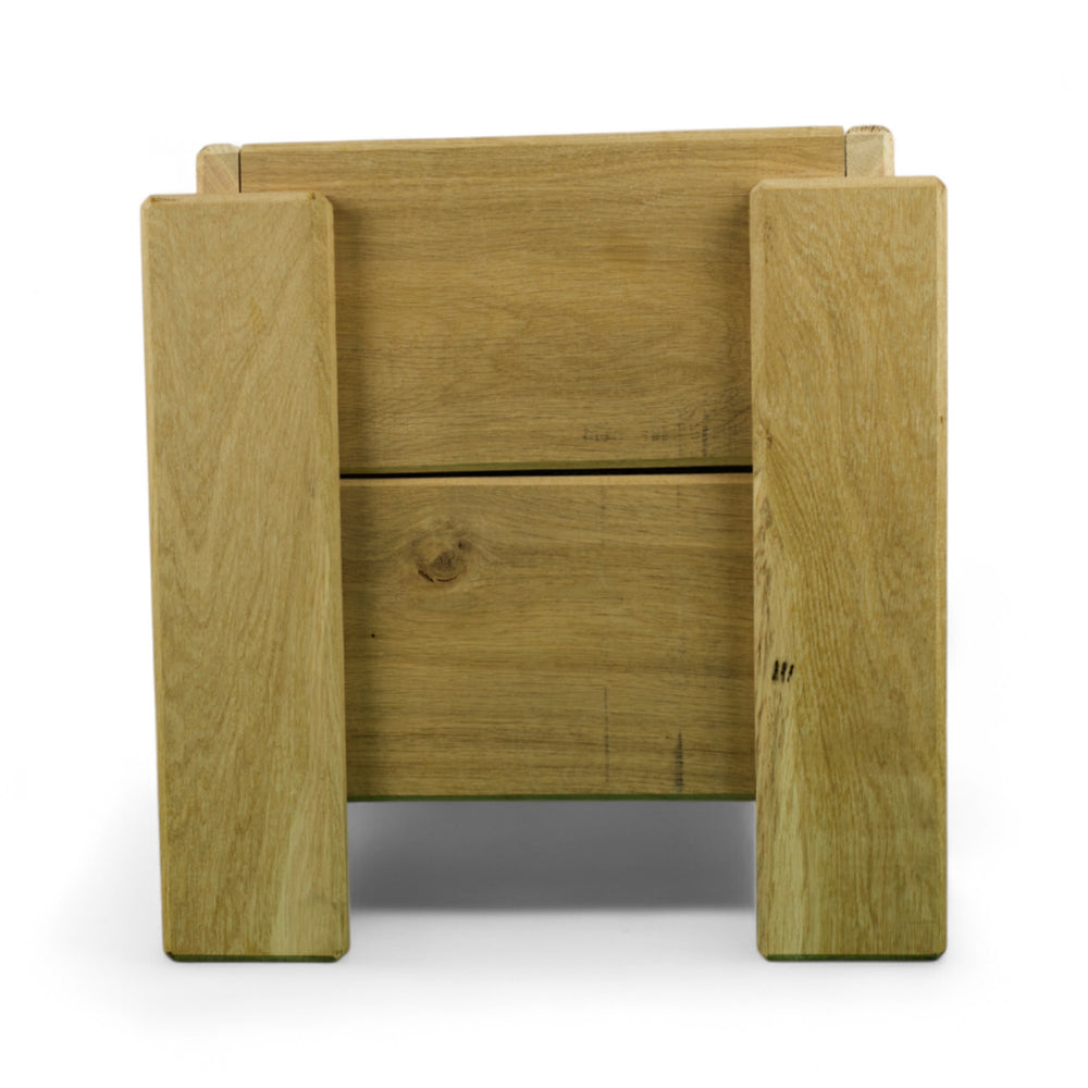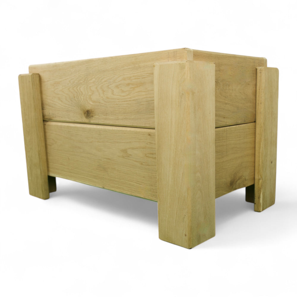 Der Verse ist ein massiver Pflanzkübel aus hochwertiger Eiche, der mit seiner klaren Form und der naturbelassenen Oberfläche zeitlose Eleganz ausstrahlt. Die schöne Maserung und der warme Farbton des Holzes kommen besonders gut zur Geltung und machen jedes Stück zu einem Unikat. Durch seine rechteckige Form eignet sich der Verse ideal, um längere Blumenarrangements oder kleine Sträucher stilvoll in Szene zu setzen.