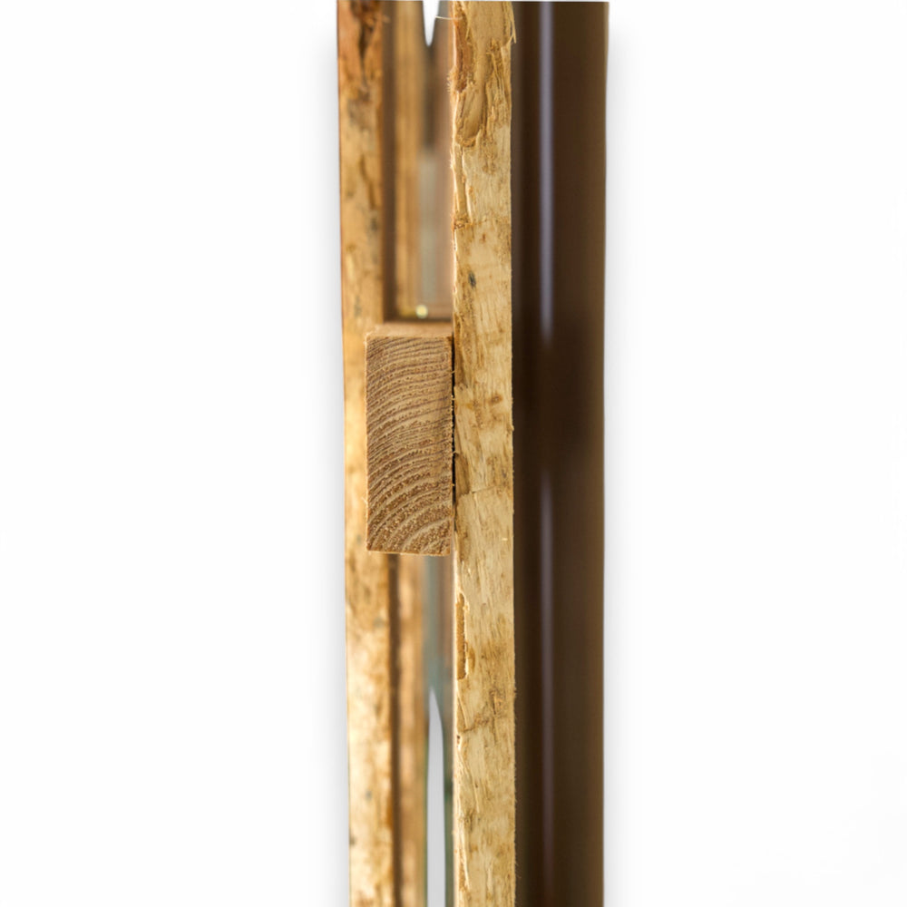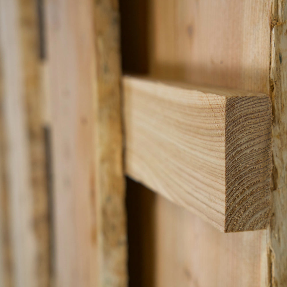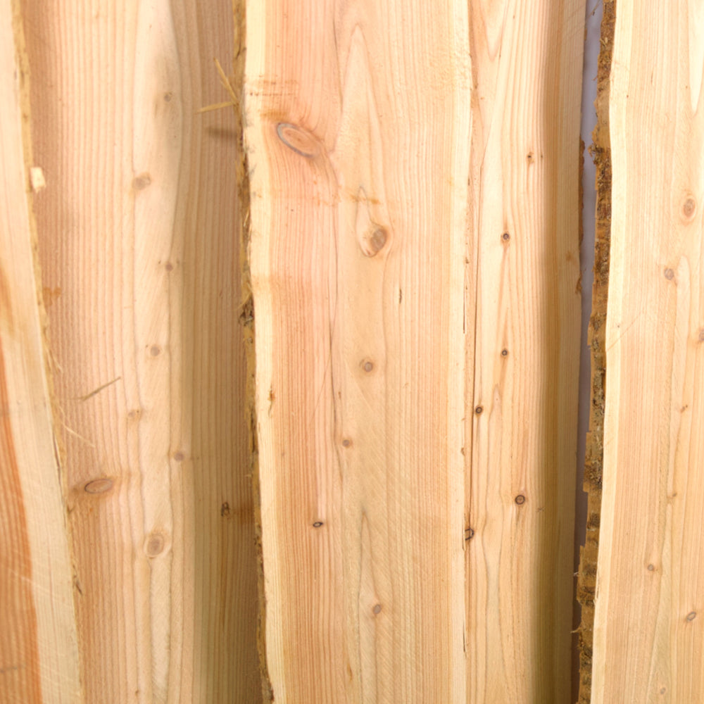Die Lärche stammt aus nachhaltiger Forstwirtschaft und kommt ganz ohne chemische Behandlung aus. Dank ihrer natürlichen Widerstandskraft ist sie besonders langlebig, wetterfest und entwickelt mit der Zeit eine elegante silbergraue Patina. Die unregelmäßige Form der Lamellen verleiht jedem Element ein individuelles Aussehen – kein Stück gleicht dem anderen.